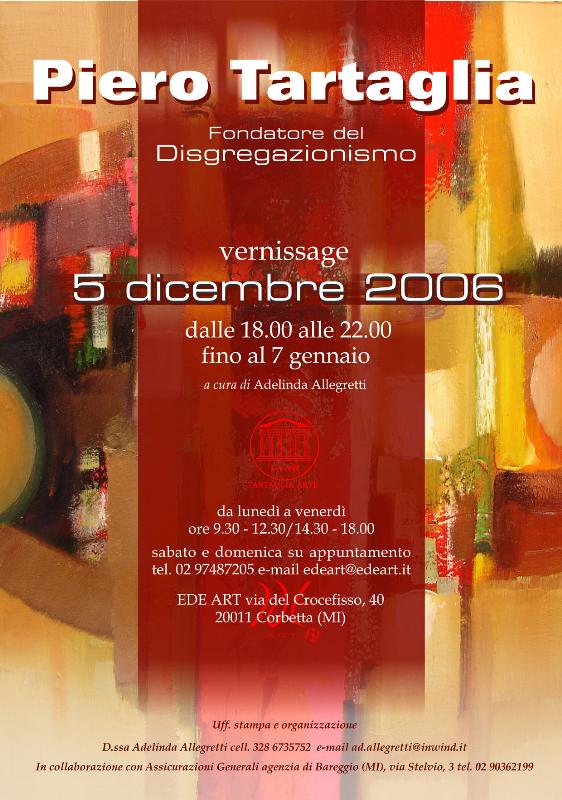 Sublimazione. Se c’è un termine che possa cercare di fornire una chiave di lettura per le opere di Piero Tartaglia è proprio questo. Sublimazione dell’oggetto, del quotidiano, della realtà che ci circonda, delle emozioni che ci offuscano la mente o che attanagliano il cuore, dei ricordi che balzano alla memoria, della paura. Sublimazione di ogni aspetto della vita. Dietro ogni opera d’arte prima dell’artista c’è l’uomo - che vive, sente, a volte gioisce ma molto più spesso soffre - , ma quando ciò che gli antichi chiamavano dionisiaco prende il sopravvento, quando la divinità si impossessa dell’anima umana, travolgendola ed annientando ogni rigor di logica, allora è l’Artista ad emergere ed a divenire egli stesso un demiurgo. E nelle opere di Tartaglia questo scarto tra quotidianità e sublime è talmente evidente che quasi si rende tangibile. L’azione della pennellata, la ricchezza cromatica, le forze centrifughe e centripete che si ostacolano a vicenda creando un’esplosione di energia che la bidimensionalità del supporto a stento riesce a trattenere, contribuiscono a rendere viva, palpitante ogni sua creazione. Difficile non rimanere emotivamente coinvolti dai lavori di Tartaglia, come pure immaginare che, almeno in origine, il bianco ha regnato, candido ed incontrastato, su quelle stesse tele che ora sono dominate da una ricchezza cromatica e materica ottenuta grazie all’utilizzo di oli e vernici. Pochi i titoli che accompagnano il corpus delle sue opere, a voler guidare la visione e la percezione del fruitore, che invece altrove è volutamente lasciata libera di cercare un senso personale: I cedri del Libano in cui addirittura si leggono con evidente nitidezza le foglioline verdi degli alberi, Naufragio dove, proprio partendo dal titolo siamo spinti a ricercare la forma della nave ed i volti della disperazione – e quanti se ne trovano! – , Presenze, in cui lettere dalla silhouette scura dominano lo spazio con la loro ingombrante presenza fisica – è l’uomo, essere comunicante per antonomasia? –. Un’ultima considerazione sulle opere più recenti qui esposte, datate 2006 e caratterizzate da un formato ridotto (di 60x60 cm appena), che contribuisce a renderli dei piccoli e preziosi gioielli. In Fu forma una sorta di scuro triangolo si incunea in una massa magmatica dagli effetti quasi metallici, e ne viene fagocitato. È la sublimazione, per ritornare a noi, della paura. L’Arte vince su tutto. Ed il circolo si chiude. Torino, 19 novembre 2006