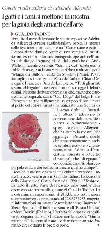Dal 4 al 28 febbraio 2018 Adelinda Allegretti Curator Studio&Gallery ospita la mostra collettiva internazionale a tema dal titolo “Come cane e gatto”. Lo spazio espositivo, situato all’interno di un casale in pietra del XVIII secolo, è immerso nel verde delle colline umbre, a circa 20 km da Assisi e da Gubbio.
